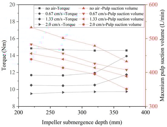 The relationship between torque and suction volume with impeller submergence depth at different air superficial velocities (330 rpm).