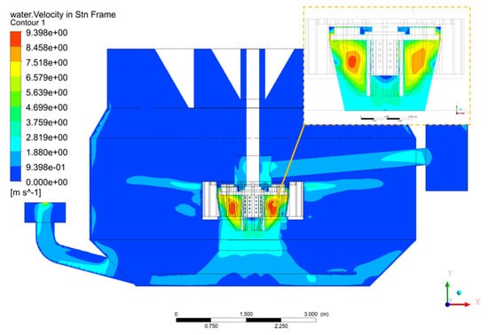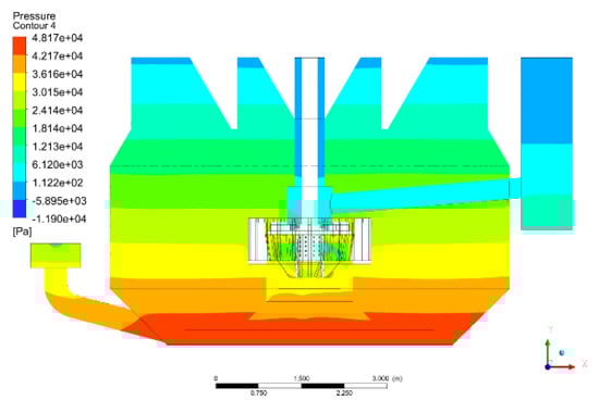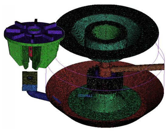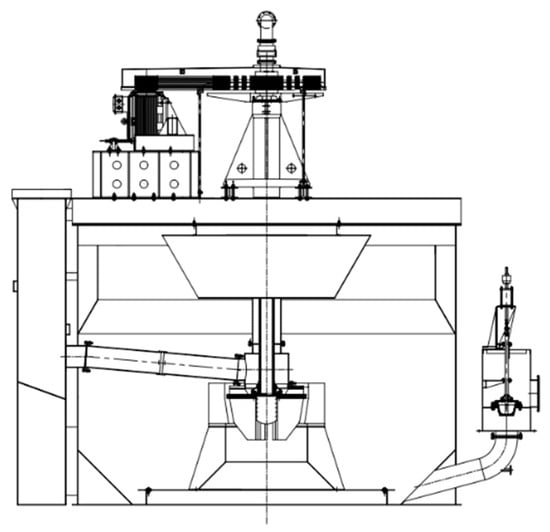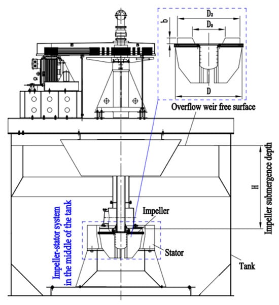 Based on the previous analysis, conventional scale-up methodologies prove inadequate for large-scale forced-air self-aspirating flotation machines under traditional design frameworks. The limitations of the traditional design necessitate an alternative approach. Drawing from both the enlargement theory and practical experience with air-forced flotation machines, this study presents an innovative design for large-scale forced-air self-aspirating flotation machines. The key improvement is the placement of the impeller–stator system in the middle of the tank, as illustrated in Figure 7. Enlarging the flotation machine based on the traditional bottom position of the impeller–stator system, shown in Figure 1, would lead to a fast increase in the impeller submergence depth with scaling up. This makes it difficult to produce larger negative pressure, which is the driving force in pump feeding or middling when the impeller submergence depth is large. Therefore, to meet the suction requirements, the power consumption of the flotation machine would increase drastically with scaling up based on the original design. However, by positioning the impeller–stator system centrally, the issue of the impeller moving farther from the overflow weir during scale-up is eliminated and the pulp suction resistance does not increase drastically as the equipment size grows. Therefore, this new design offers a more efficient and scalable solution for large-scale flotation machines, addressing the core challenges of conventional scale-up methods, including the issue of increased energy consumption.