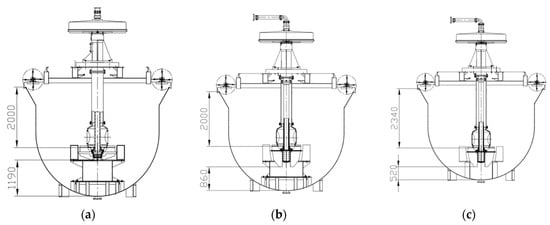 To verify the feasibility and correctness of the developed design scheme for a large forced-air self-aspirating flotation machine, an industrial experiment system was established based on the 50 m3 forced-air self-aspirating flotation machine. The industrial experiment system was designed to comparatively analyze three flotation machine designs, as illustrated in Figure 8. Scheme I adopted a middle-mounted impeller design with an impeller–stator system identical to that of the original 50 m3 forced-air self-aspirating flotation machine. Scheme II also employed a middle-mounted impeller design, but the lower impeller blades were designed according to the impeller dimensions of a conventional 50 m3 air-forced flotation machine. Scheme III utilized a bottom-mounted impeller design (the original configuration of the forced-air self-aspirating flotation machine) but incorporated a new impeller structure. The key design parameters of the three schemes are summarized in Table 4.