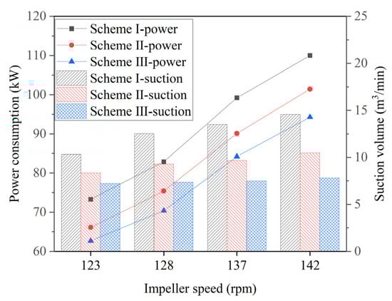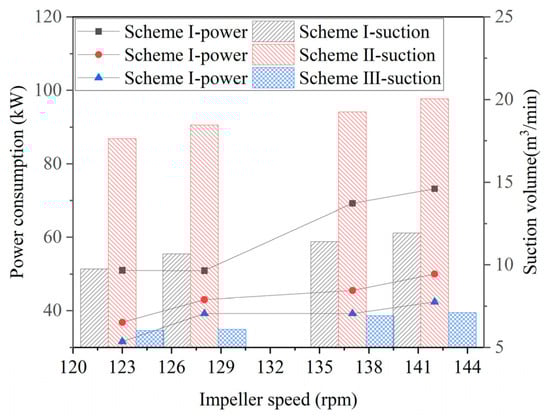 The power consumption and suction volumes of the three design schemes with different speeds without aerating.