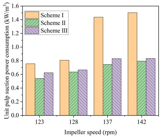 Figure 10 further analyzes the differences in unit pulp suction power consumption among the three impeller design schemes. The conventional impeller with the middle placement design exhibits consistently higher unit power consumption than both new impeller designs. Moreover, its unit suction power consumption increases noticeably with rising rotational speed, indicating a significant decline in suction efficiency at higher speeds. In contrast, both the middle placement and bottom placement designs show relatively stable unit pulp suction power consumption in the new impeller across different speeds, maintaining values in the range of 0.5–0.8 kW/m3. While the overall pulp suction capacity of the new impeller with the middle placement design is comparable to that of the conventional design, it achieves this with lower energy consumption. Although the new impeller with the bottom placement design has the lowest unit power consumption, its total suction capacity is relatively limited. Therefore, from a comprehensive performance perspective, the new impeller with the middle placement design demonstrates the best overall performance.
