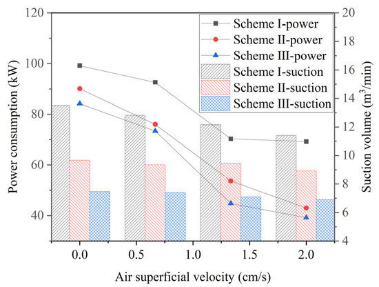 The power consumption and suction volume of three design schemes with varying air superficial velocities (137 rpm).