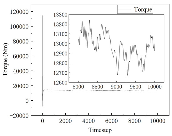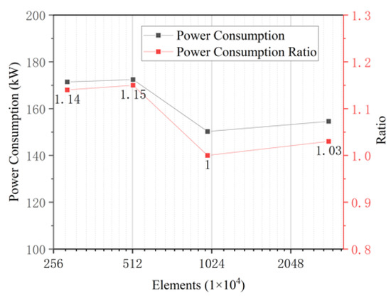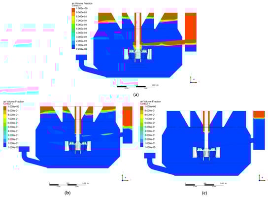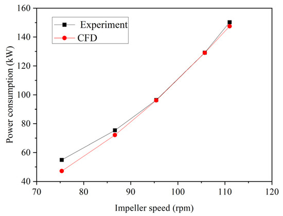 Figure 26 presents a comparison of the power consumption between the CFD simulation predictions and the experimental measurements using a frequency inverter at different impeller speeds under non-aerated conditions. The simulation results closely match the industrial test data, with the predicted power consumption being slightly lower than the measured values. The average deviation is only 4%. In engineering applications, a deviation of less than 10% between simulation results and experimental measurements is generally considered acceptable and meets the requirements for engineering. This discrepancy is likely due to inverter-based power measurements, which directly capture the total operating power consumption of the motor and inverter, introducing a small deviation. The flotation machine is equipped with a 10-pole variable-frequency motor (220 kW), which inherently includes efficiency losses and a relatively low power factor (cosφ) of only 0.78. These factors contribute to a higher measured power. Additionally, it is challenging to use more precise instruments such as torque transducers for direct power consumption measurement in an industrial test. In contrast, the CFD simulation predicts the shaft power, which does not account for motor or inverter losses. This is the primary source of deviation between the CFD simulation and experimental measurements. While some computational error is inevitable in simulations, the close agreement between the simulation and experimental data demonstrates that the deviation is within an acceptable range and further validates the reliability and accuracy of the simulation method.