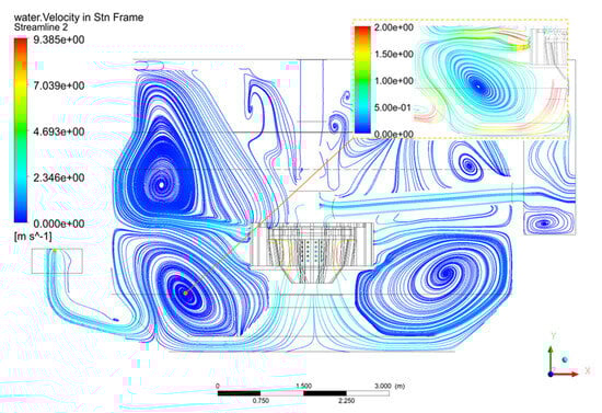 The CFD simulation study predicted the pulp suction capacity, circulation capacity, and gas–liquid dispersion characteristics of a large-scale forced-air self-aspirating flotation machine. The results demonstrate that the scale-up method is effective from a numerical simulation perspective. However, engineering practice remains the most direct and reliable standard for validating the scale-up approach. To further verify the methodology, a fluid dynamics study and metallurgical performance tests were conducted. The first 160 m3 forced-air self-aspirating flotation machine was developed for a 10,000 t/d copper–sulfur mining project in Guangdong province, China, aiming to improve the sulfur metallurgy index; In addition, it is the largest one of forced-air self-aspirating flotation machines. The system, including the feeding box and tailing box, is shown in Figure 24.