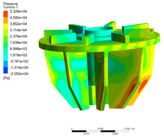 The pressure distribution and air accumulation of the impeller with a feeding rate of 9.8 m3/min and air superficial velocity of 1.67 cm/s.
