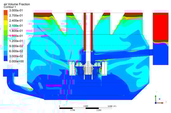 In summary, the new design scheme and scale-up method for the forced-air self-aspirating flotation machine successfully enables the pulp suction function in large-scale flotation machines while significantly reducing the power consumption ratio of pulp suction to the total power consumption of the machine. This optimization has resulted in a well-balanced system, achieving an efficient relationship between pulp circulation capacity, pulp suction capacity, and overall power consumption, ensuring improved performance and energy efficiency in large-scale flotation processes. CFD simulations also predicted the hydrodynamic performance of the 160 m3 forced-air self-aspirating flotation machine, including pulp suction volume, circulation volume, and gas–liquid dispersion characteristics. After optimization of the CFD simulation, the large-scale flotation machine could be used to conduct industrial tests.