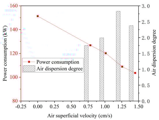 The power consumption and air dispersion of the flotation machine at different air superficial velocities are presented in Figure 27, with a constant speed of 110 rpm. The results show that as the air superficial velocity increases, the power consumption decreases, while the air dispersion tends to improve. As a key indicator of gas–liquid dispersion efficiency, the air dispersion degree is observed to be approximately 2, indicating a homogeneous gas–liquid mixture. This finding aligns well with the CFD simulation study (Figure 22), which predicted a good air dispersion effect, further validating the simulation’s accuracy in modeling the flotation machine’s hydrodynamic performance.
