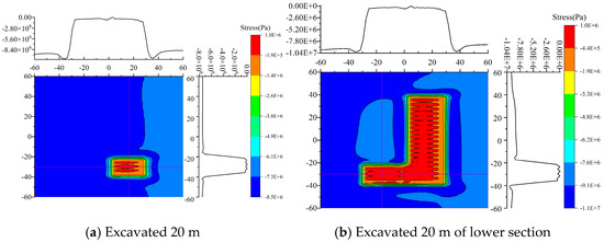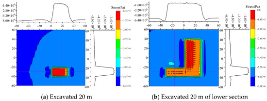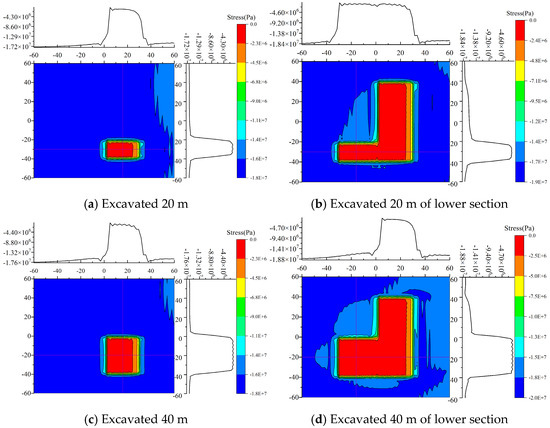 After the initial equilibrium of the model was achieved, excavation of the upper and lower subsections was carried out, where each subsection was excavated for up to 80 m. A boundary influence zone of 60 m was left at the two ends of the working face in the advance direction. Excavation of the working face was carried out sequentially, with 4 m of excavation at each time. Excavation of the upper subsections at 20 m, 40 m, and 80 m, as well as the lower subsections at 20 m, 40 m, and 80 m, could not be analyzed due to the limitations of this study. Therefore, only some of the experimental results of the simulation process were analyzed, that is, 40 m and 80 m in the upper section and 20 m, 40 m, and 80 m in the lower section.