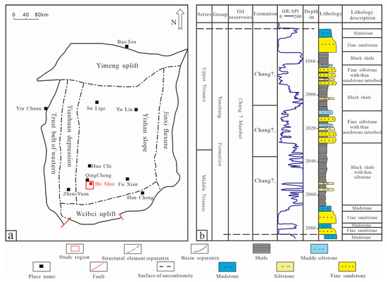 - Tang, H.P.; Chen, S.J.; Zhang, X.W.; Huang, Y.L.; Yao, Y.T. Influence of physical property and pore throat structure on oiliness of tight sandatone reservoir: Taking Chang7 oil-bearing formation in Huachi-Heshui Area of Ordos Basin as an example. Fault-Block Oil Gas Field 2015, 22, 198–201. [Google Scholar]
