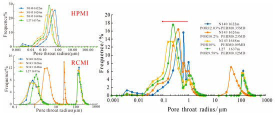 - The pore shapes are mainly parallel-slit and ink-bottle shapes. The pore radius is mainly distributed in the range of 30 to 200 µm, and the throat radius is mainly distributed in the range of 0.3 to 2 µm.