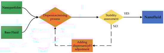 To achieve homogeneous dispersion, techniques such as ultrasonic agitation [26], high-pressure homogenization [16], and those reported in [27] are commonly used. However, stability remains a challenge due to nanoparticle aggregation. Surface treatments and surfactants are often employed to mitigate this effect and prolong nanofluid stability.