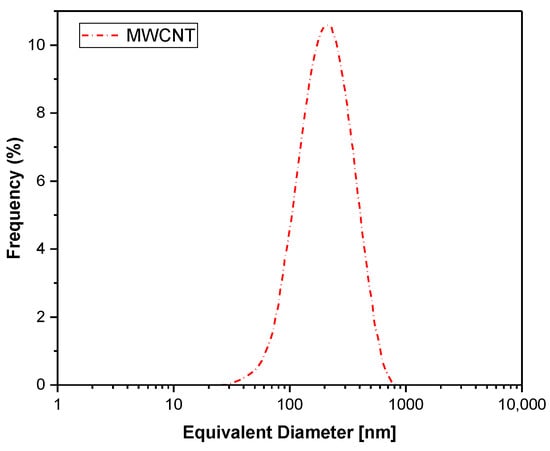 Figure 3 shows that the equivalent diameter was approximately 300 nm. The discrepancy between the measured values and the manufacturer’s data can be attributed to statistical variations in the sample or potential measurement errors associated with the tubular shape of carbon nanotubes. As noted by [58], methods used to assess nanotube nanoparticle dimensions often provide approximate, rather than exact, values. Due to their high aspect ratio (length/diameter), assuming a spherical shape for a single nanotube is not valid. However, MWCNT agglomerates can be approximated as globally spherical structures.