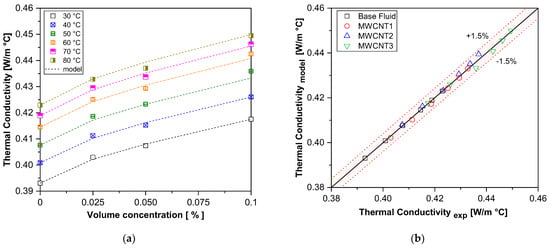 Due to the lack of a suitable model to predict the thermal conductivity of functionalized carbon nanotube nanofluids at temperatures up to 80 °C, a new correlation was developed based on experimental data. The proposed model, described by Equation (5), was derived using the curve-fitting method with the Marquardt–Levenberg algorithm, as suggested by [67], and implemented in MATLAB Version 8.5 (R2015a). This method optimizes the coefficients of the independent variables (volume concentration and temperature) to achieve the best fit, minimizing the sum of squared differences between experimental and predicted values:
