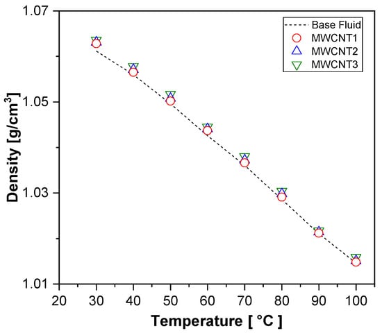 Experimental results for density for MWCNT nanofluids and base fluid.