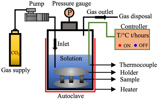 The setup for the autoclave corrosion experiments is schematically shown in Figure 1, which comprises a s-CO2 supply system, a s-CO2 pump, an autoclave (316 stainless steel, 1 L capacity), a real-time temperature controller, and a gas disposal line. All experiments were controlled at a total pressure of 8 MPa and 50 °C for 96 h. As displayed in Figure 1, the specimens were immersed in the H2O-rich phase (i.e., s-CO2-saturated 3.5 wt.% NaCl solution) to simulate the CO2 injection environment.