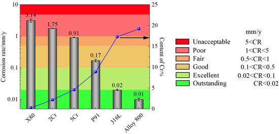 Corrosion rates of alloys with increasing Cr content exposed to s-CO2-saturated SW at 50 °C and 8 MPa after 96 h.