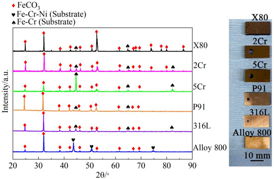 Figure 3 shows the photographic images and XRD spectra of all the alloys after being exposed to s-CO2-saturated SW at 50 °C and 8 MPa for 96 h. Compared with freshly prepared specimens with a metallic color, the dark color presented on X80, 2Cr, and 5Cr steels suggested the formation of thick corrosion layers on their surface. Unlike them, P91 exhibited a lighter dark color on its surface, implying the presence of a thinner corrosion layer on its surface. For the alloys with a higher Cr content, their surface color was brighter compared to P91. To identify the phase compositions of the formed corrosion products, XRD analyses were conducted, and the collated XRD spectra are shown in Figure 3. The results indicate that corrosion products formed on these alloys are mainly composed of iron carbonate (FeCO3, ICDD PDF No. 29-0696), along with their respective substrates.
