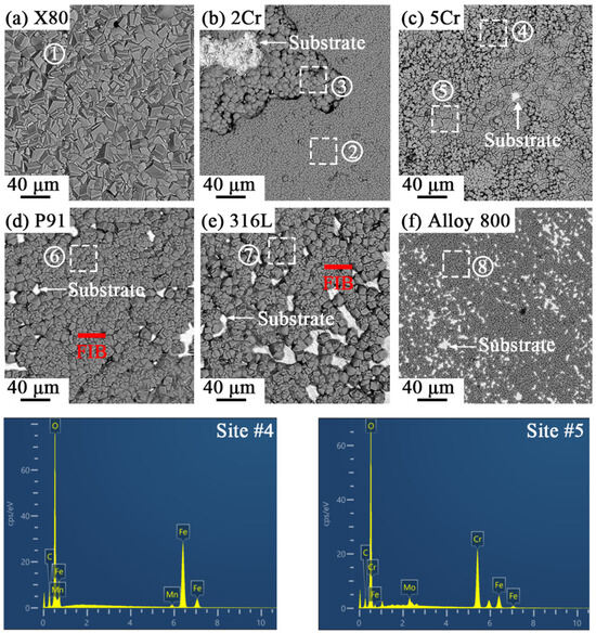 Based on the above results, the corroded surfaces of the samples in the s-CO2-saturated SW were subjected to further SEM/EDS examinations on elemental distribution mapping. The backscattered electron (BSE) images obtained are presented in Figure 4. X80 formed a dense corrosion layer, while corrosion layer spalling and/or microcrack formation occurred on 2Cr and 5Cr surfaces. With an increase in the Cr content, the surface morphologies of corroded P91 and 316L were different from the low-Cr steels as relatively uniform and small crystalline products were presented on them. For Alloy 800 with a Cr content close to 20%, a very thin and compact layer was grown on its surface after exposure. To analyze the elemental variation and distinguish the corresponding phases as shown in the XRD spectra (see Figure 3), point-scanning EDS analyses were carried out at specific sites marked on the SEM images, and the results are listed in Table 2 (Sites #1 to #8). To improve the accuracy of the results, the element composition of each area was collected five times. Figure 4 presents the EDS spectra for sites #4 and #5, illustrating the process of characterizing elemental composition. The uniform layer (site #1) on the surface of X80 is composed of Fe, C, and O, consistent with the XRD results. Similar to X80, the outer corrosion layer on 2Cr (site #2) and 5Cr (site #4) also consisted of Fe, C, and O. But their inner corrosion layer (sites #3 and 5) had Cr, and the concentration of the Cr cation in the layer likely increased with an increase in the Cr content in the bulk steels. A similar two-layer structure was also found on a 3Cr steel after being exposed to a NaCl solution saturated with 0.8 MPa CO2 for 32 h, where the outer layer was FeCO3 and the inner layer was a mixture of amorphous FeCO3 and Cr(OH)3 [34]. These results suggest that the corrosion process of low-Cr (≤5 wt.%) steels in CO2 or a high-pressure s-CO2-saturated NaCl solution might be dominated by the same mechanism. The results in Figure 3 and Figure 4 also indicate that the inner Fe/Cr layer might be much thinner compared to the outer FeCO3 layer on the steels. For the alloys (P91, 316L, and Alloy 800) with a higher Cr content, the EDS results for sites #6, 7, and 8 show the surface corrosion layers on these alloys are mainly composed of Fe, C, and O, consistent with the XRD results.