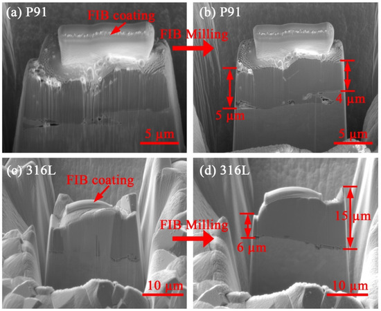 SEM images taken during the FIB operation on P91 and SS 316L samples after s-CO2-saturated SW exposure.