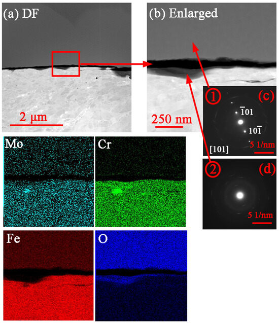 Cross-sectional TEM analyses of P91: (a) DF image, (b) enlarged interface EDS mapping images, and (c,d) selected-area electron diffraction (SAED) images of regions 1 and 2.