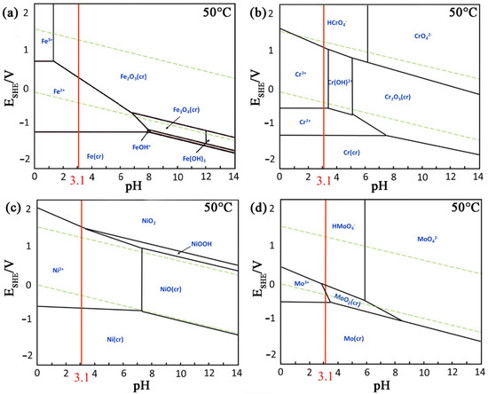 Established Pourbaix diagrams of (a) Fe, (b) Cr, (c) Ni, and (d) Mo in an aqueous solution at 50 °C.