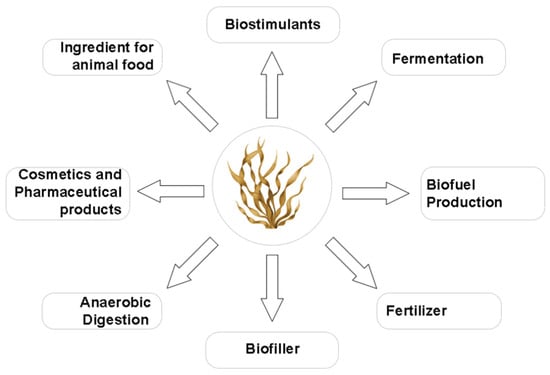 The growing interest in the marine ecosystem is due to the diversity of bioactive compounds in algae and essential organisms, representing 20% to 30% of global aquaculture production. Macroalgae are one of the main marine organisms, generally clustered on beaches due to the natural movement of the sea [1]. Worldwide, the production of marine macroalgae reached 36.5 million tons in 2022, resulting in an increase of 4.1% compared to 2020 [1,2]. However, 75% of this biomass is discarded after the hydrocolloid and polysaccharide extraction process, generating significant volumes of waste. Despite little exploration, this waste has the potential for valorization due to bioactive compounds, such as phlorotannins, pigments, and other phenolic compounds [3,4]. The valorization of seaweeds emerges as a sustainable alternative for entirely using this residual biomass, enabling its application in the pharmaceutical, cosmetic, food, bioenergy, and biofuel industries, as illustrated in Figure 1 [5].