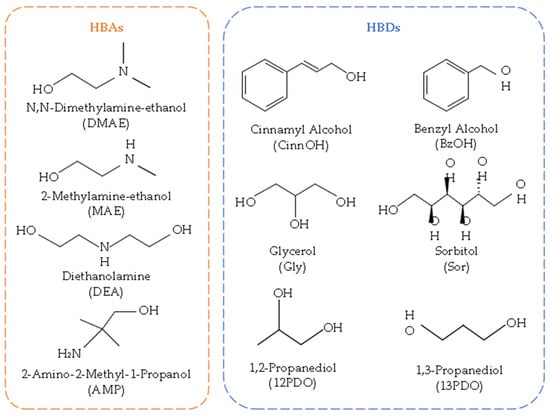 Molecular structures of compounds used to form the eutectic solvent mixture, divided into HBA and HBD.