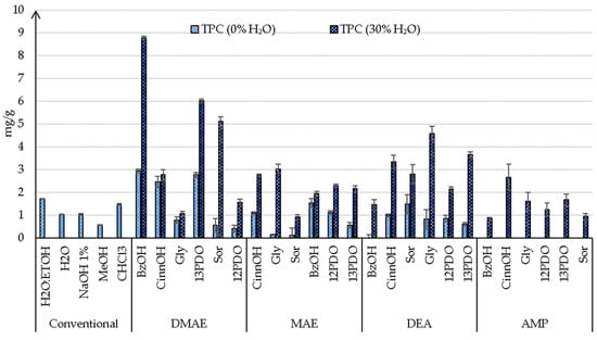 Comparison of yields of phenolic compounds (TPC—mg GAE/g) extracted with eutectic solvents with (30%) and without the addition of water (0%). Statistical analyses are presented in Table A1.
