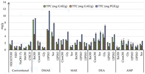 Figure 4 shows the results regarding the content of phenolic compounds and phlorotannins with the addition of 30% water to the DES system (solute and solvent). The effectiveness of deep eutectic solvents (DESs) in the extraction of phenolic compounds and phlorotannins is related to the characteristics of their components: alkanolamines (hydrogen bond acceptors, HBA), and alcohols (hydrogen bond donors, HBD).