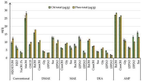 The yields in Figure 6 indicate that alkanolamines and polyols interact with chlorophyll and pheophytin through hydrogen bonds and polar interactions, which are essential for extracting and stabilizing pigments. However, unlike some studies, pigments are unstable in alkaline pH (6–13). Under alkaline conditions, excess OH− deprotonates phenolic groups, forming anions and degrading the conjugated structure of pigments, especially chlorophyll and pheophytin, which have sensitive porphyrin rings [76]. Alkaline treatment partially degrades chlorophylls a and b into water-soluble derivatives, maintaining the green color. Depending on the conditions (volume, temperature, presence of oxygen), reactions, such as dephytylation by chlorophyllase occur, forming chlorophyllides, or oxidation of the isocyclic ring, generating phytyl-chlorin or phytyl-rhodin [76,77]. Chlorophyll c, lacking a phytol chain, undergoes pheophytinization in an alkaline medium, losing Mg2+ and forming pheophytin c, which is less stable [78]. On the other hand, carotenoids, such as β-carotene and lutein, are stable in alkaline pH, maintaining their structures intact, as they lack functional groups sensitive to deprotonation or hydrolysis [79,80].