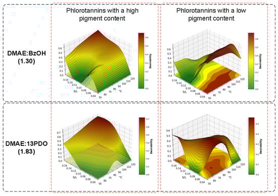 The temperature of 74.39 °C and a solid-to-liquid ratio (S/L) of 0.03 were the optimal conditions for maximizing the selectivity of phlorotannins in the eutectic solvent DMAE:BzOH (1.30) while maintaining low levels of pigments. For DMAE:13PDO (1.83), a temperature of 69.44 °C and an S/L ratio of 0.03 were the most suitable for phlorotannin selectivity. However, the conditions that provided the highest volumetric concentration of phlorotannins varied: for DMAE:BzOH, a temperature of 120.36 °C and an S/L ratio of 0.17 were the most effective, while for DMAE:13PDO, a temperature of 120.36 °C and an S/L ratio of 0.14 were the most appropriate (Figure 7).