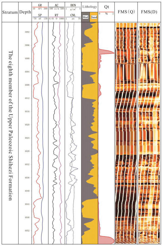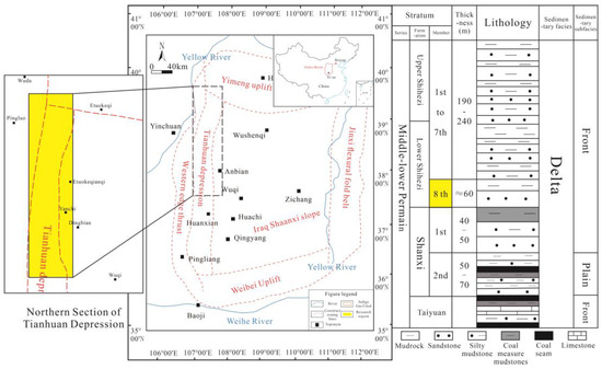The northern Tianhuan section exhibits a well-preserved Upper Paleozoic succession. The stratigraphic sequence from base to top consists of the Carboniferous Benxi Formation, Taiyuan Formation, Permian Shanxi Formation, Lower Shihezi Formation, Upper Shihezi Formation, and Shiqianfeng Formation, in ascending order. This sedimentary series contains the principal rock type and gas-bearing intervals, with their spatial distribution demonstrated in Figure 1. The lithological assemblage primarily comprises a marine–continental transitional sedimentary system, predominantly characterized by shallow-water deltaic depositional environments. Notably, the He 8 member within the Shihezi Formation displays well-developed braided river delta facies characteristics [3,17,18].