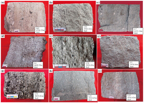 The coring of the He 8 member in the northern section of the Tianhuan Depression, Ordos Basin. (a) Light gray coarse-grained quartz sandstone, well Li 11, lower section of the He 8 member, 2850.43 m; (b) Gray-white medium-grained lithic quartz sandstone, well Li 20, lower section of the He 8 member, 4391.09 m; (c) Gray medium-coarse quartz sandstone, well Li 2, lower section of the He 8 member, 3774.3 m; (d) Gray medium-coarse grained lithic quartz sandstone, well Li 57, lower section of the He 8 member, 3786.38 m; (e) Gray-white medium sandstone, well Li 39, lower section of the He 8 member, 3989.20 m; (f) Gray-white medium-coarse grained sandstone, well Li 59, lower section of the He 8 member, 3824.49 m; (g) Shallow gray coarse grained lithic quartz sandstone, well Li 7, lower section of the He 8 member, 4054.63 m; (h) Gray-white gravelly coarse-grained quartz sandstone, well Li 23, lower section of the He 8 member, 4481.74 m; (i) Gray-white gravelly coarse-grained quartz sandstone, well Li 23, lower section of the He 8 member, 4482.77 m.