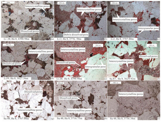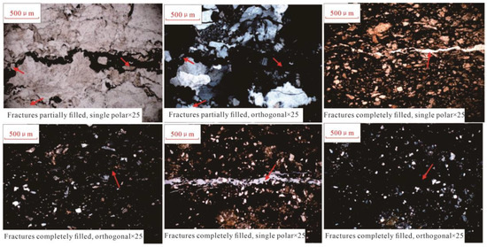 The main secondary pores are developed in the He 8 member of Shihezi Formation in the northern section of the Tianhuan Depression, such as dissolved pores, intercrystalline pores, intergranular pores, debris dissolved pores, etc., and the fractures are filled with clay minerals to varying degrees. (Figure 8 and Figure 9). The red arrows refer to the clay minerals filling in the cracks, which are white or grayish white under a single polarizing microscope and black under an orthogonal microscope.