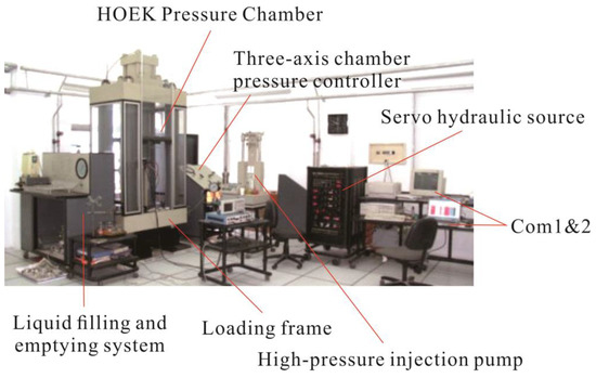 In this paper, Terratek’s three-axis rock mechanics test system is selected for testing (Figure 4). The instrument can simulate different environmental temperature and pressure conditions, record the change of the target parameters of the test sample rock, and then generate the stress–strain curve by Excel. By comparing the curves and comparing the results with each other, it is easy to obtain the deformation characteristics and relative size of different types of rocks. The following Table 1 contains the main environmental indicators of the experiment.