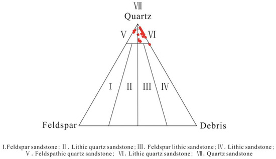 In order to further clarify the petrological characteristics of the reservoir, according to the three-terminal element classification of sandstone, the rock composition of the sandstone samples of the He 8 member of the well in the north of Tianhuan was plotted (Figure 6). The results show that the main components of the target layer in the study area are quartz sandstone and lithic quartz sandstone (Table 2). Among them, the content of quartz is the highest, accounting for more than 75%, up to 90%, and the content in the lower section of the He 8 member is slightly higher than that in the upper section; the content of rock debris is about 15%. The content of feldspar in most samples is less than 5%, but some of them can reach more than 20%. The type of debris is mainly rigid debris, mainly metamorphic rock debris, followed by sedimentary rock and magmatic rock debris. The combination of a high volume fraction of quartz and a low volume fraction of cuttings gives the reservoir strong pressure resistance, which is conducive to the formation and preservation of pore structure, provides reservoir space for oil and gas molecules, and is an important condition for the formation of high-quality reservoirs [3,12,17].