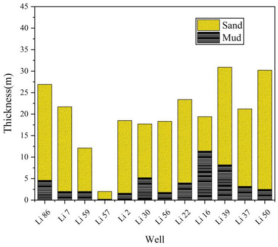 Stratigraphic analysis of 12 cored intervals within the study area enabled quantitative evaluation of sand-shale distribution patterns in the Upper Paleozoic He 8 member in the northern Tianhuan Depression. Analytical results revealed a predominant sandstone thickness exceeding mudstone deposits by a factor of 5.2:1. This lithological configuration demonstrates favorable geological conditions for tight gas accumulation within the He 8 reservoir unit (Figure 7).