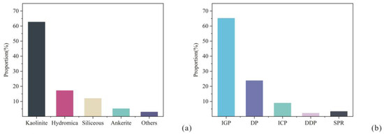 Statistics of reservoir pores and interstitial material types in the He 8 member of the northern section of the Tianhuan Depression. (a) Pore type; (b) Interstitial material type.