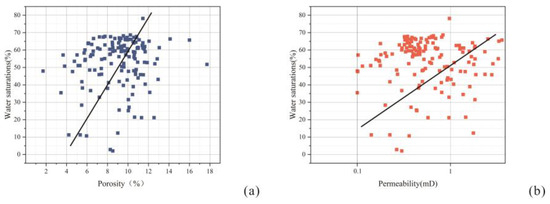 Correlation diagram of reservoir physical properties of the He 8 member in the northern section of the Tianhuan Depression. (a) Correlation between porosity and water saturation; (b) Correlation between permeability and water saturation.