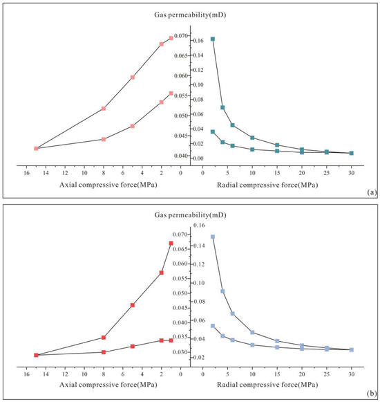 The results show that when the axial pressure is a fixture value, the gas permeability of the core decreases with the increase of the radial pressure, and reaches the minimum value at the fracture point. Subsequently, as the pressure gradually decreases, the gas permeability gradually increases but cannot reach the initial value. When the radial pressure is constant, the change trend of core gas permeability with axial stress is the same (Figure 11). Therefore, it is believed that the existence of fractures affects the size of permeability and plays an important role in improving reservoir physical properties [20,21,22].