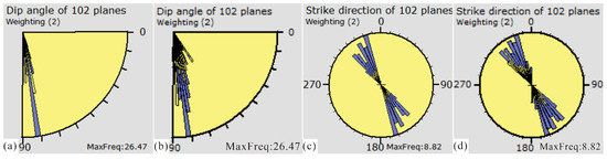 Statistics of reservoir fracture occurrence in the northern section of the Tianhuan Depression. (a) Linear projection of fracture dip angle; (b) Isometric projection of fracture dip angle; (c) Linear projection of fracture strike; (d) Isometric projection of fracture strike.