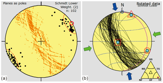 Reconstruction map of paleostress field in the He 8 period of the northern Tianhuan Depression. (a) Schmidt network positioning point data distribution; (b) Stress field reconstruction.