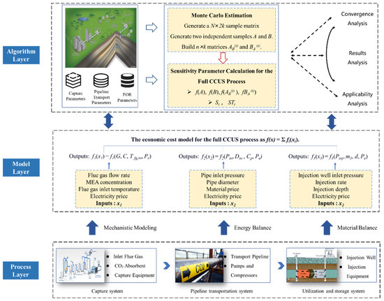 Given the complexity of the entire CCUS process, this study develops a multidimensional, multi-hierarchical global sensitivity analysis framework for the full-chain CCUS system, employing the Sobol’ method with Monte Carlo estimation. The framework quantifies the impact of key parameter variations on the system’s economics. It employs an integrated “parameter, model, algorithm” approach and features a modular architecture with three core levels: process, model, and algorithm, as shown in Figure 1.