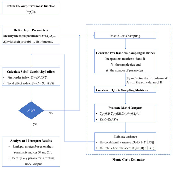 The Sobol’ method, introduced in 1993 [31], is a global sensitivity analysis approach based on variance. It decomposes the model into functions of individual input variables and combinations of multiple input variables. These functions consist of 2N terms derived from multiple integrals. By quantifying the contribution of each variable (or variable combination) to the total output variance, the corresponding sensitivity coefficients are calculated.