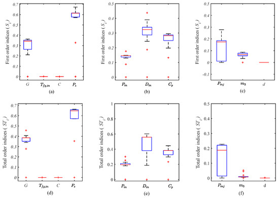 Among the top six parameters, the width of the confidence intervals of is 0.8788, which is about 5.5 times the width of , which is only 0.1596. This result indicates that the value of for the sample is very stable for , while it fluctuates greatly for . In order to visually and clearly identify the outliers in the data, this paper uses a boxplot, as shown in Figure 4. The median of the sample data is located at the center of the boxplot (red line), the length of the box represents the interquartile range, and the ends of the box must be the upper and lower limits. Outliers are defined as sample data points that are greater than or less than . The boxplot can not only reflect the characteristics of a dataset’s distribution but also determine whether the distribution of normal values is concentrated or scattered. The upper box pattern (Figure 4a–c) represents the first-order sensitivity , and the lower box pattern (Figure 4d–f) represents . The difference between and represents the interaction of this parameter with all other parameters. For example, the difference in is about 0.2352, indicating that it has a strong interaction with the other parameters. At the same time, the size of the rectangular box indicates the degree of dispersion of the data. The rectangular box of the parameter has a large area, indicating that the data are relatively scattered. , , , , , and are less dispersed. Furthermore, , , and are not well shown due to their low sensitivity.