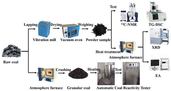 The experimental procedure is schematically illustrated in Figure 1. Raw coal samples were initially processed through mechanical pulverization and oven drying at 120 °C to obtain powder samples. A subset of these powdered samples was directly subjected to analytical characterization. Another portion underwent programmed thermal treatment in an atmosphere furnace prior to subsequent analyses. Furthermore, selected thermally treated samples were mechanically crushed and sieved to obtain granular samples (3–6 mm particle size distribution). The reactivity of these granular coal specimens was systematically evaluated using an Automatic Coal Reactivity Tester.
