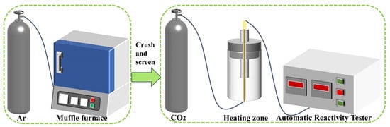 The experimental steps are illustrated in Figure 2. Since carbonaceous reductants participate in reactions at approximately 1567 °C during metallurgical-grade silicon (MG-Si) production []. A temperature of 1600 °C was selected as the maximum experimental temperature in this study. The coal samples were thermally treated in a muffle furnace (argon atmosphere) at temperatures of 900 °C, 1300 °C, and 1600 °C for 1 h, respectively, to remove volatile matter and produce coal char. After crushing and sieving, coal coke samples with particle size of 3–6 mm were obtained. The particle size of each type of coal was strictly controlled within the range of 3–6 mm to eliminate the influence of particle size on reactivity. We loaded 20 g coal samples into the heating zone of a TMH-0305 Automatic Coal Reactivity Tester’s tube furnace and packed corundum fragments into the remaining tube space. The concentration V (%) of CO2 in the reacted gas was determined by passing CO2 at a constant rate of 500 mL·min−1 for 2.5 min at intervals of 50 °C within 750–1300 °C. The conversion of CO2 at this temperature, α (%), was calculated using the following Equation (6):