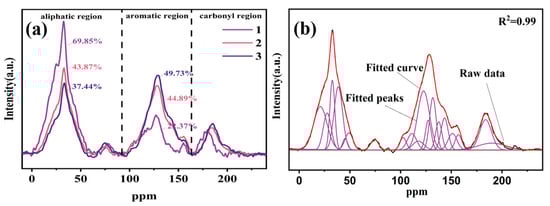 (a) 13C-NMR results of three raw coals; (b) peak fitting of coal 2.