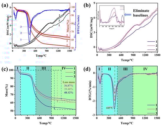 Because MG-Si production is carried out at high temperatures, processes such as pyrolysis and graphitization of the coals occur with increasing temperature. This significantly affected the physicochemical properties and production results. In order to study the differences in the pyrolysis processes of the three coals, the TG–DSC test was performed under the same conditions, and the results are shown in Figure 4. The DSC curves of coal fluctuated throughout the pyrolysis process. After removing the baseline, different peaks appeared at various temperatures owing to pyrolysis and the reaction of coal during heating. The coal pyrolysis process can be divided into four stages, which are represented by I, II, III, and IV in Figure 4c,d. The first stage was the water removal stage, and the DSC also exhibited an endothermic dehydration peak in this stage []. The main pyrolysis stage of coal occurs around 500 °C, which removes small molecules from coal at a high speed []. Obviously, the pyrolysis rate and weight loss of the No. 1 coal were higher than those of the No. 2 and No. 3 coals. The third stage is 500–900 °C. At this stage, pyrolysis of residual small molecules and partial polycondensation reactions occur []. The differences in the pyrolysis curves of the three coal samples at this stage further expanded. The weight loss rates of the three coal samples were significantly reduced after 900 °C, indicating that the coal had basically removed volatile matter at 900 °C. The fourth stage was 900–1500 °C, as the high-temperature pyrolysis stage of coal, the condensation reaction mainly occurred in the coal. The weight loss peak around 1300 °C might be related to the removal of small molecules such as H2 and CH4 []. Simultaneously, the coal underwent graphitization. The degree of ordering increased rapidly, and the change in weight during this process was small. The total weight loss rates of the three coals were 48.12, 39.4, and 36.8%, respectively. The weight loss rate of the No. 1 coal was significantly higher than those of the No. 2 and No. 3 coals.
