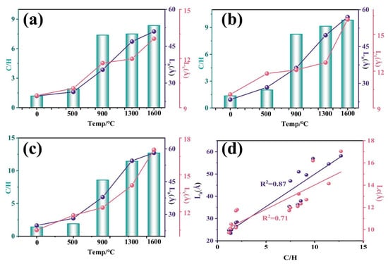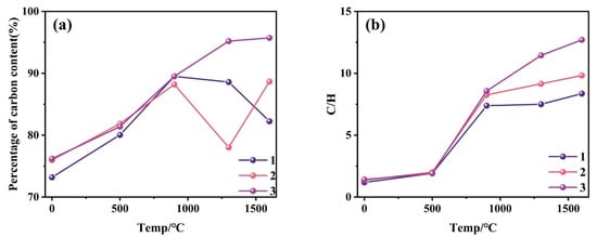 The percentage of C and the variation in C/H with the temperature of the three coals are shown in Figure 5a,b. The percentage of C showed an increasing trend with temperature. However, owing to the influence of ash and other elements, the percentage of C fluctuated to a certain extent. All three coal samples C/H were positively correlated with temperature, and the trends of C/H with temperature were very similar for the three coal samples. Although carbon was affected by the fluctuation, the same effect on hydrogen made C/H less affected, resulting in a more stable C/H pattern. All water and some volatiles were removed at 0–500 °C, and C/H showed an increasing trend. In the 500–900 °C stage, the coal underwent pyrolysis to remove volatile matter, and all three coals showed a sharp increase in C/H. The growth trends of the No. 2 and No. 3 coals were slightly higher than that of the No. 1 coal. In the 900–1600 °C stage, the graphitization reaction of dehydrocyclization occurred, the C/H increased, and the C/H growth rate of the No. 3 coal was always higher than that of the No. 1 coal. This finding confirmed that the three coals had different trends of dehydrocyclization, and the No. 3 coal was more likely to form a larger graphitoid system with a higher degree of ordering.